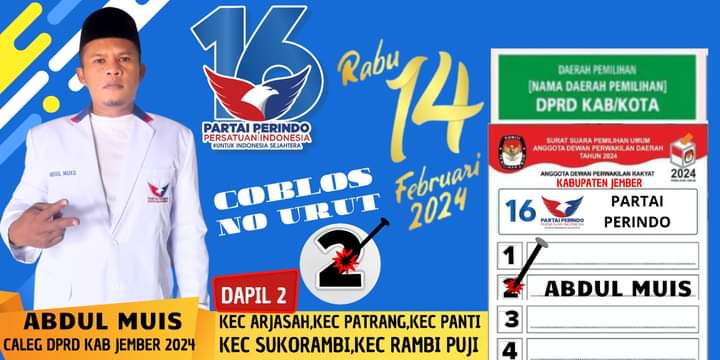 JEMBER, Suara Jember News – Namanya Abdul Muis Beliau adalah adalah Calon Legislatif DPRD Kab Jember Dapil 2 nomor urut 2 meliputi kecamatan Arjasa, Patrang, Sukorambi,Panti, Rambipuji dari PartaiPerindo Abdul Muis sosok yang peduli kepada para fakir miskin, dhuafa dan yatim piatu. Kalau terpilih menjadi anggota DPRD Kab Jember, gajinya 30 persen di khususkan kepada […]